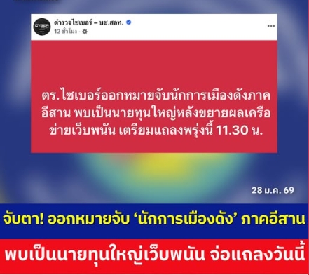 จับตา! ตำรวจไซเบอร์ขอศาลออกหมายจับ 'นักการเมืองดัง' ภาคอีสาน พบเป็นนายทุนใหญ่เว็บพนัน