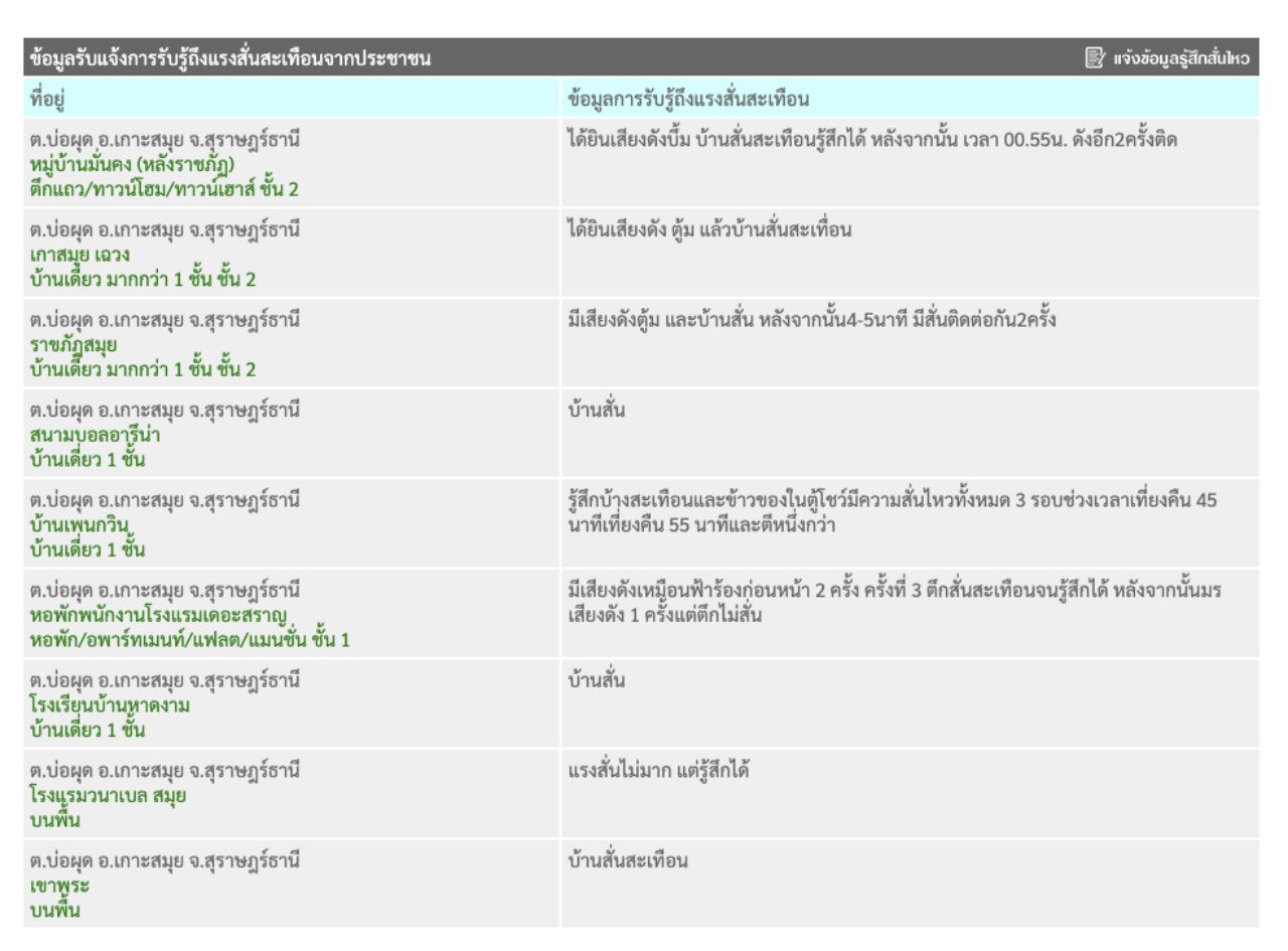โดยพบว่ามีประชาชน แจ้งข้อมูลการรับรู้ถึงแรงสั่นสะเทือน หลายพื้นที่ ดังนี้